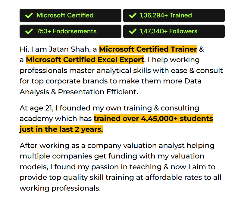 "Jatan's Masterclass has literally fastracked my career by 10 years. I can't believe I used to spend hours doing what I can do in minutes after enrolling & learning from Jatan. Thanks to him, I am an expert in Excel, Power BI, AI, PowerPoint, Tableau & SQL!" - Rishikesh